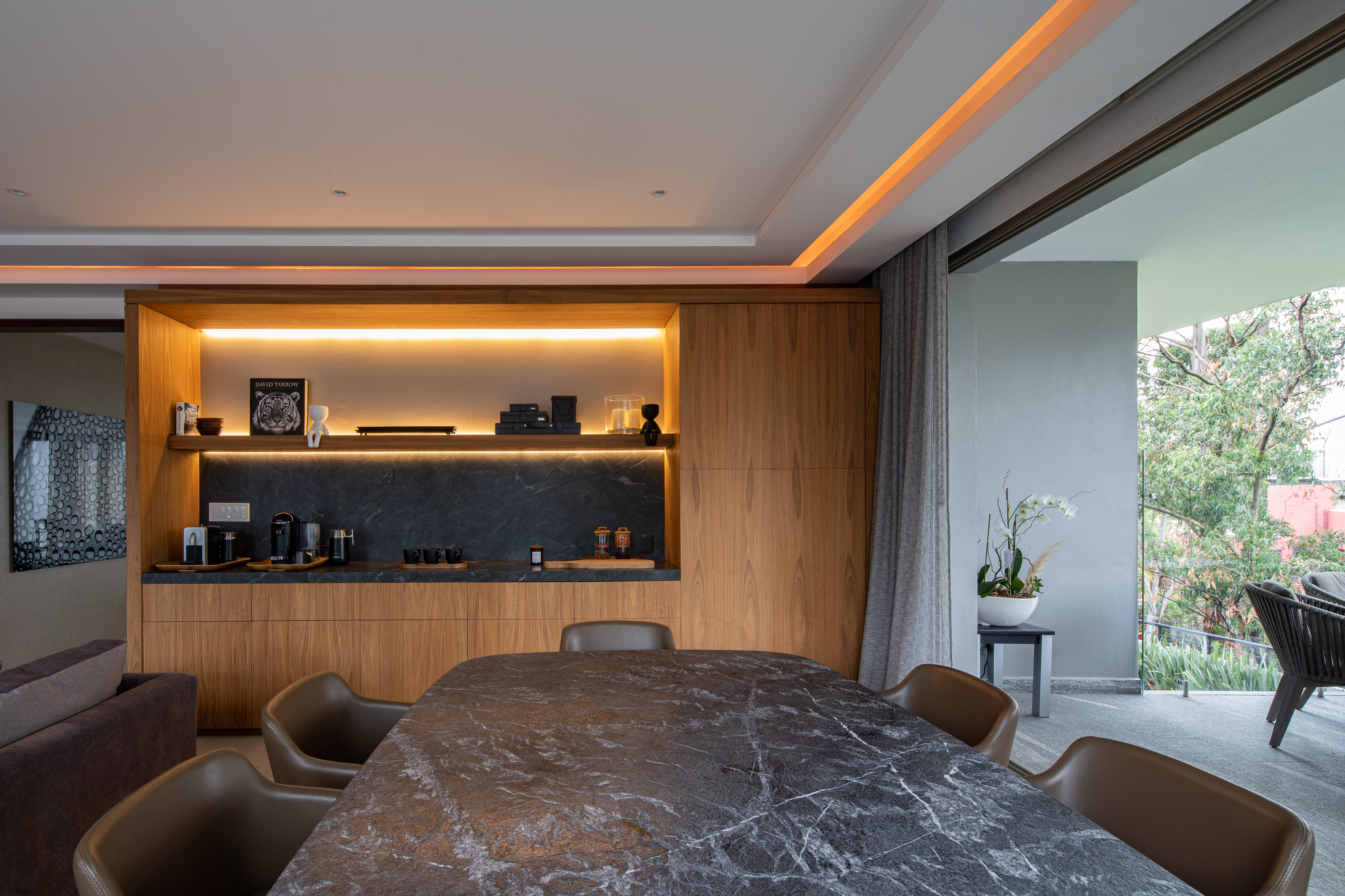 Este proyecto consistió en remodelaciones puntuales. Se generó una nueva terraza y/o comedor con un área de barra con grill. En el interior se hicieron cambios de acabados y muebles fijos así como también otros muebles como las mesas de ambos comedores en madera y piedra y madera y acero.